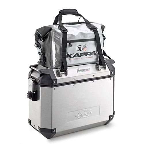 Waterproof luggage bag that can be attached to the lid of an aluminum side case using standard straps equipped with 4 double D-rings. "Roll top" closure system. Includes a strap for easy transportation.