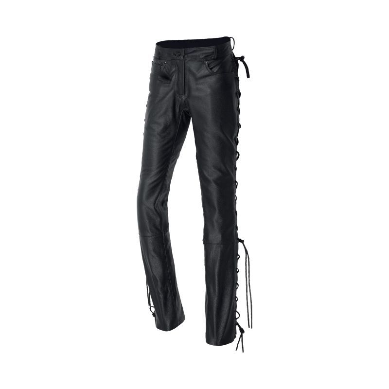 String 3 is a women's motorcycle leather pants with side ties, made of 100% calf leather and offers a classic 5-pocket style and various functional elements. The following sizes are available (see below):