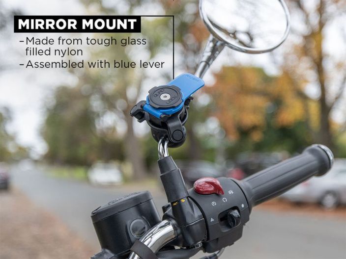 The Quad Lock® Mirror Mount allows you to securely mount your phone to standard motorcycle and scooter mirror stems and small bars.
