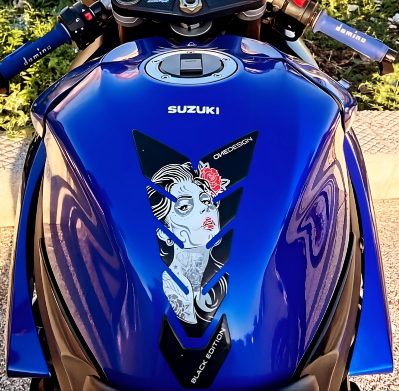 Tank pad made of transparent resin and polyurethane, glued to the central rear part of the motorcycle tank. In addition to its protective function, the protector gives the motorcycle a modern and personalized look.