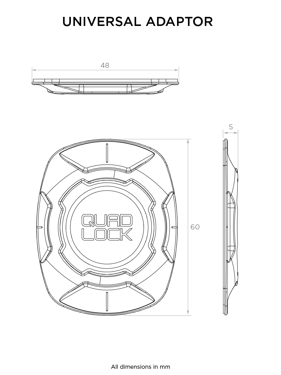 Универсалният адаптер Quad Lock разполага със сигурен заключващ механизъм, съвместим с всички видове въртящи се заключващи се стойки и може да се залепи директно към телефони, калъфи и повечето плоски метални или пластмасови повърхности.